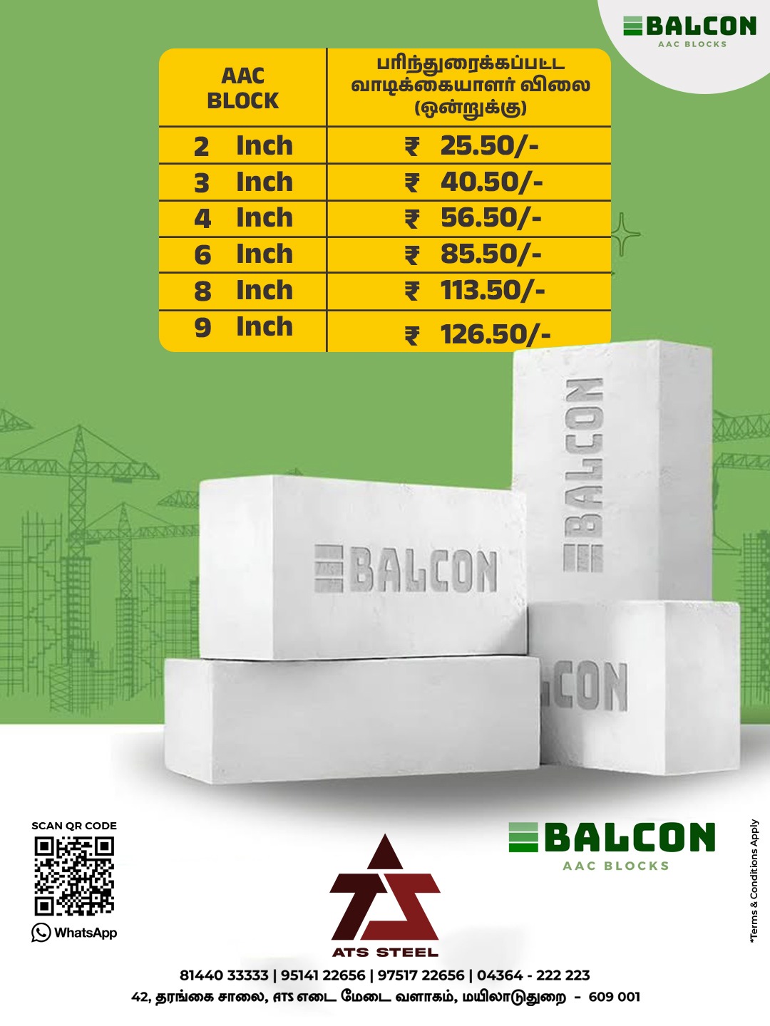 The Autoclaved Aerated Concrete (AAC) Block is a modern, eco-friendly building material rapidly gaining popularity across India. Balcon AAC Blocks have become the preferred alternative to traditional Red Clay Bricks, CC Blocks, Fly Ash Bricks, and CLC Bricks in residential, commercial, and institutional construction. Lightweight yet strong, these blocks are made from fly ash, cement, lime, and fine additives, forming a uniform cellular structure. They are cured under high-pressure steam in autoclaves, ensuring durability, thermal efficiency, and long-lasting strength.
