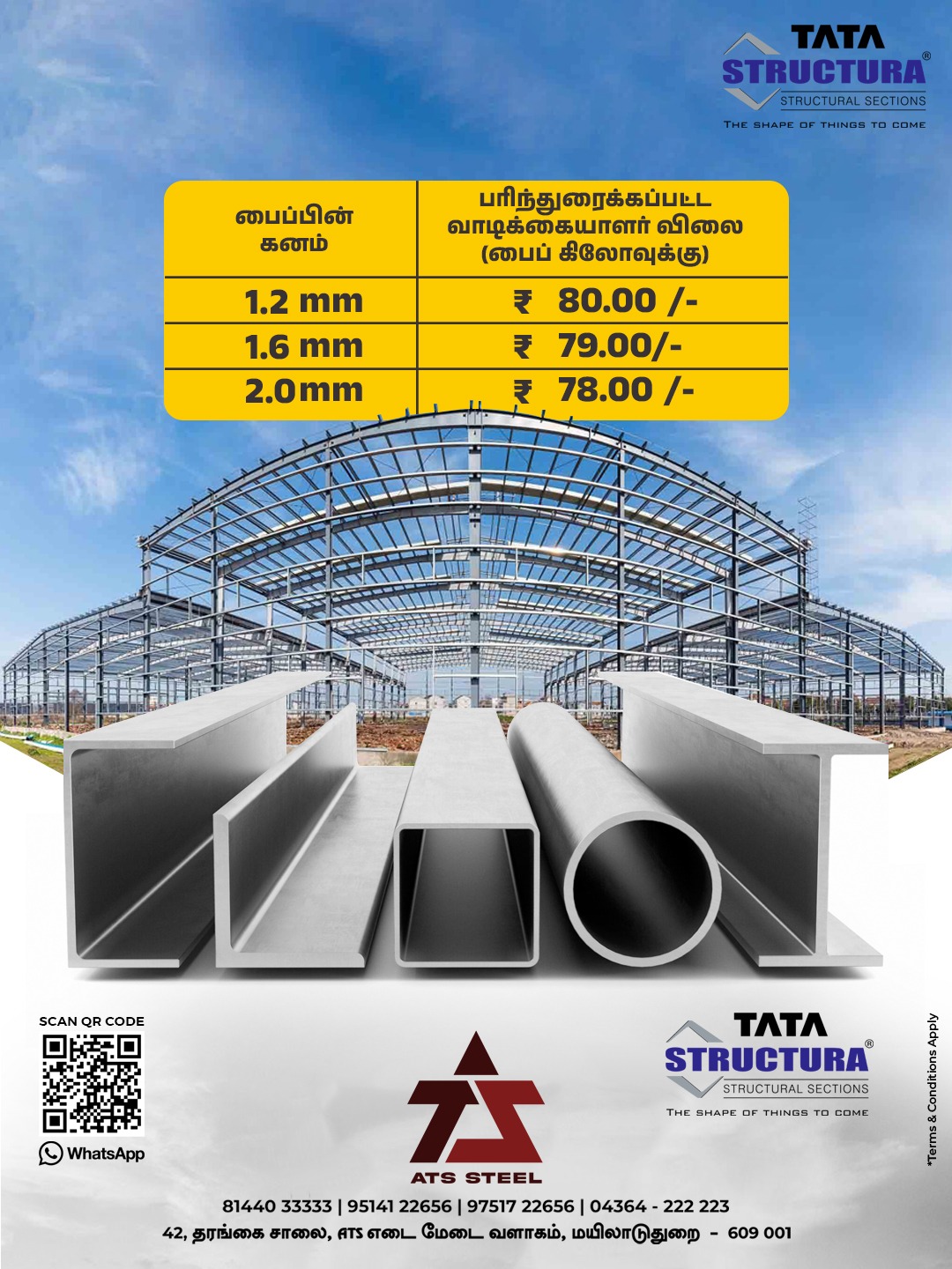 TATA Structura offers high quality structural steel tubes designed for strength, precision, and long term durability in modern construction projects. Manufactured by Tata Steel using advanced technology, these tubes provide excellent load bearing capacity, dimensional accuracy, and corrosion resistance. Widely used in residential, commercial, and industrial structures, TATA Structura supports applications such as buildings, warehouses, factories, and infrastructure developments, ensuring safety, efficiency, and reliable structural performance under demanding conditions for engineers, architects, and contractors.